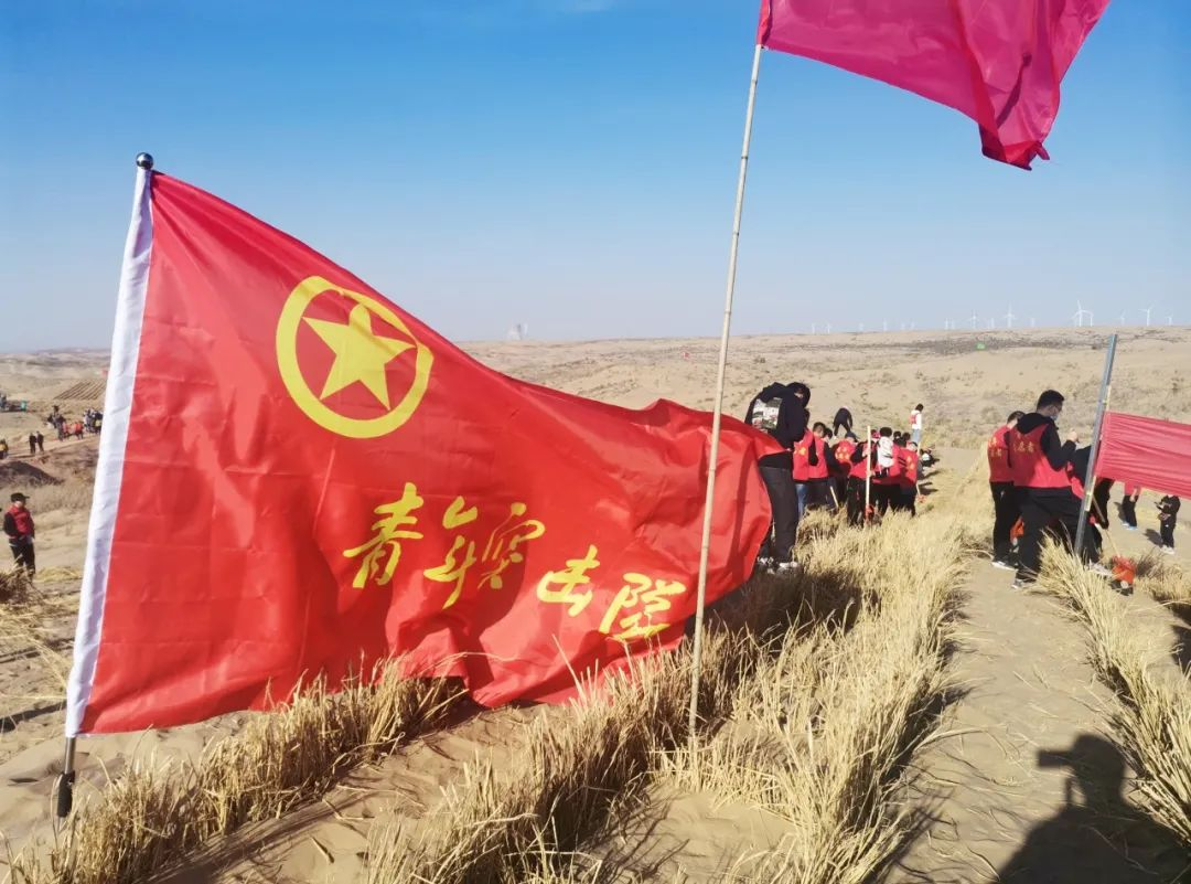 圖丨中色東方組織團(tuán)員青年在毛烏素沙地扎設(shè)草方格
