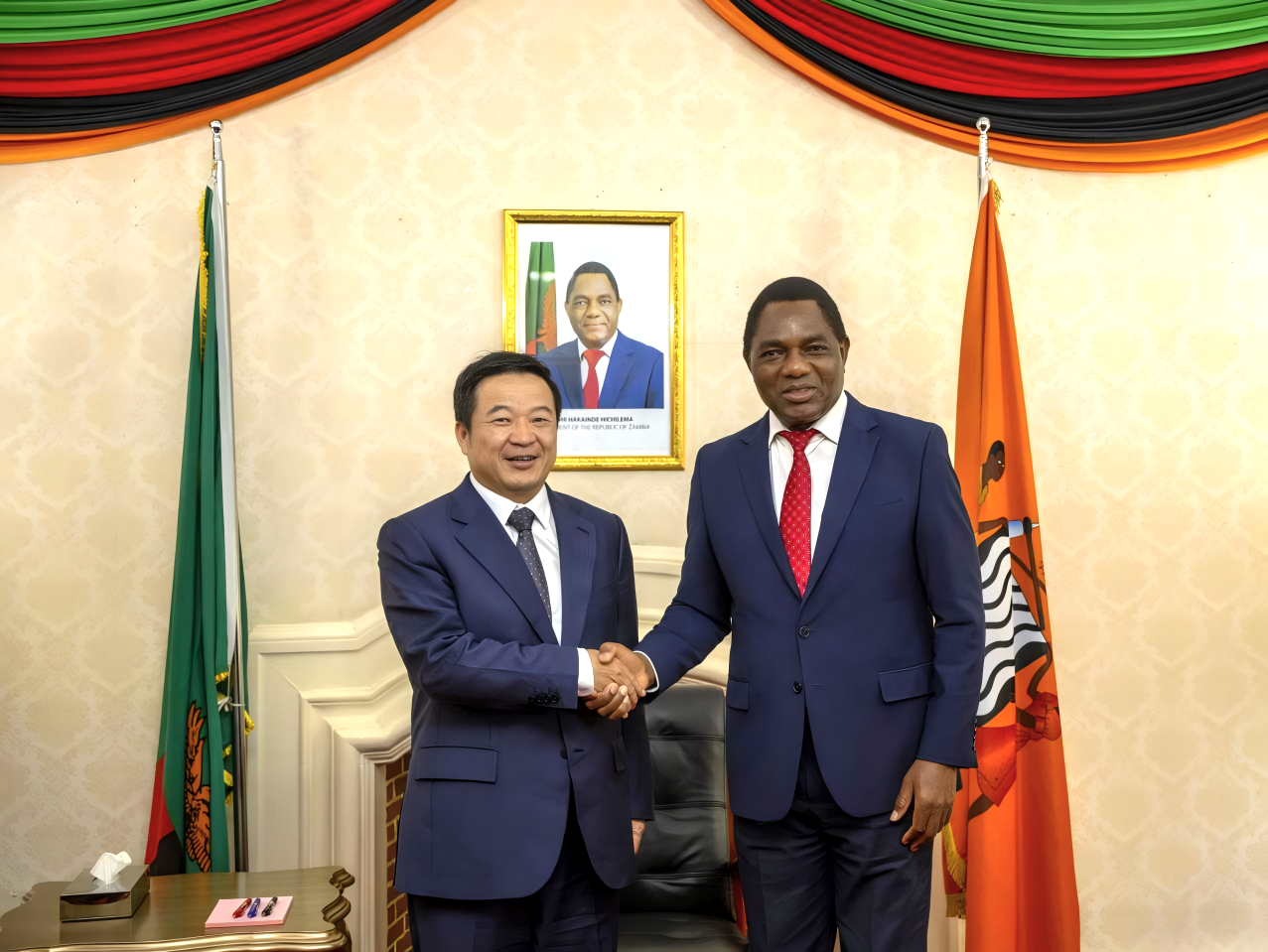 當地時間1112日,正在贊比亞調研的中國有色集團董事長文崗在盧薩卡拜會贊比亞總統哈凱恩德·希奇萊馬。這是繼93日在北京會談后,文崗與希奇萊馬總統的第二次會面,體現了中國有色集團積極響應習近平主席同希奇萊馬總統就中贊建交60周年互致賀電精神,全面落實中非合作論壇成果,深化踐行“一帶一路”倡議,持續加大在贊投資力度,深化在礦業領域的各類合作,為發展新時代中贊全天候友誼貢獻力量。