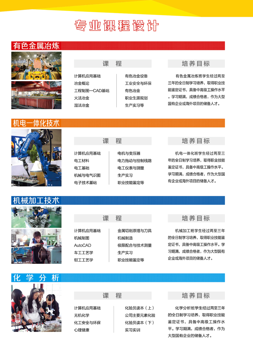 有色金屬冶煉、機電技術應用、選礦技術、工業分析與檢驗、機械加工技術